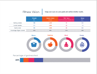Tracking fitness is an essential part of a healthy lifestyle. See your fitness goals at a glance with this excel fitness vision template. Four different "now and then" categories compare where you are to where you want to be. Keep them online as reminders or print them to inspire you daily